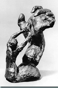 Clenched Left Hand with Figure portrays an afflicted hand in a threatening pose; however, Rodin adds a symbolic element that alters the interpretation. The contorted hand towers over a small figure, suggesting a powerful force or dominance. Rodin often combined his sculptural sketches with other figures to create assemblages with highly symbolic content (description and photo from the Cantor Foundation)